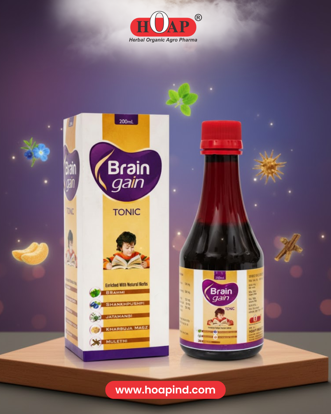 Brain Gain Tonic: A herbal brain-support tonic enriched with Brahmi, Shankhpushpi, Jatamansi, Kharbuja Magz & Mulethi to help improve memory, focus, and learning ability in children. Gentle, natural, and effective for daily mental growth.